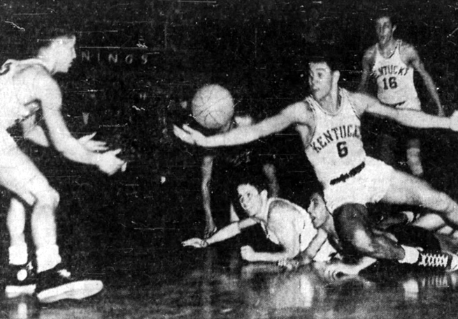 Cliff Hagan (#6) reaches for the loose ball. On the floor are Skippy Whitaker and Ole Miss' Kenny Robbins