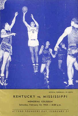 Kentucky's Billy Evans (#42) leaps for a rebound with Mississippi's Denver Brackeen while UK's Cliff Hagan (#6), Frank Ramsey (#30) and Lou Tsioropoulos (#16) look on