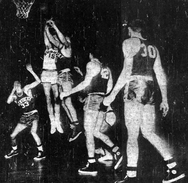 Auburn's Bill Fickling (#15) shoots over Kentucky's Lou Tsioropoulos while Jim Linville Puckett (#33), Bill Evans (#42) and Frank Ramsey (#30) look on