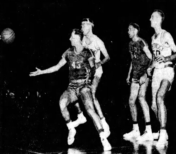 LSU's Leslie Jones (#43) reaches for the ball ahead of Phil Grawemeyer while LSU's Ned Clark (#54) and UK's Bob Burrow (#50) look on