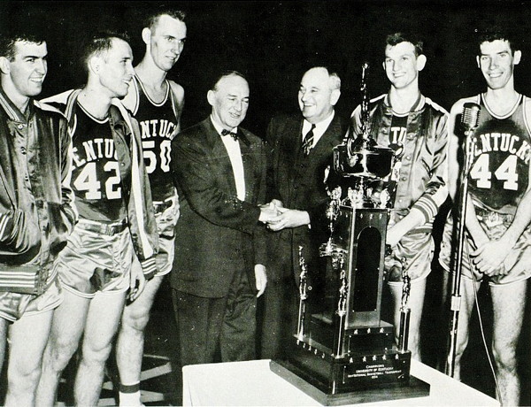 Coach Rupp is congratulated by La Salle coach Ken Loeffler while UK players Linville Puckett, Billy Evans, Bob Burrow, Jerry Bird and Phil Grawemeyer look on during the UKIT award ceremony