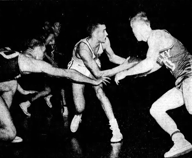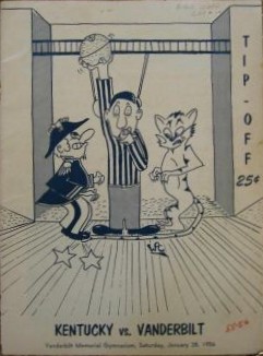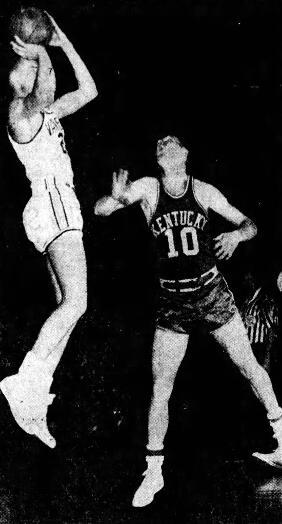 Kentucky's Jerry Bird leaps to defend the basket against Vanderbilt's Jo Gibbs (#44) while Vandy's Bobby Thym (#23) and Charlie Harrison look on
