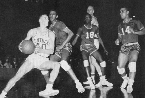Kentucky scored first on Jerry Brid's crip but Wayne soon shot ahead and the Cats after leading briefly 8-7, didn't show on top again until two straight baskets by Burrow gave UK a 19-17 lead with eight minutes to play in the first half.