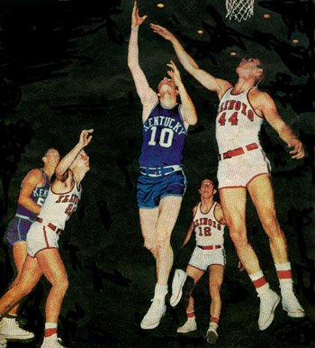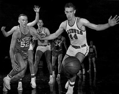 Gerry Calvert (10) scores in front of Illinois' Don Ohl (44)
