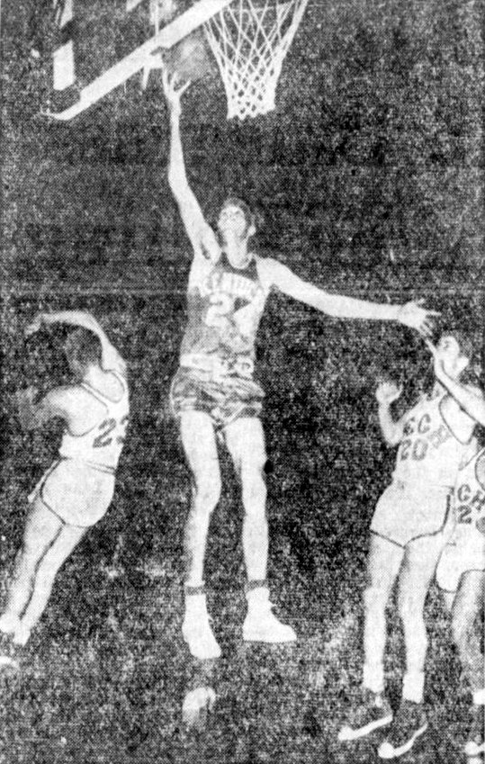 Johnny Cox (#24) slips in for a layup between Virginia Tech's Lew Mills (#23) and Terry Penn (#20)