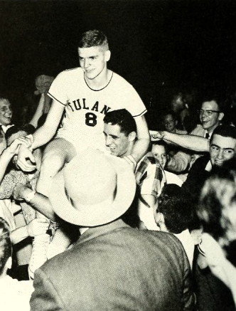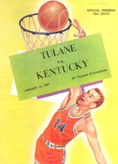 A Tulane player is surrounded by Kentucky players including Gerry Calvert (#10), Johnny Cox, Ray Mills and Ed Beck (#34)