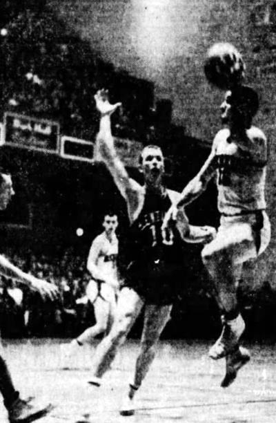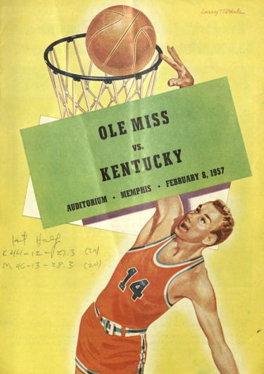 Action proceeds under the basket while Johnny Cox (far left) is called for fouling Ole Miss player Wayland Inman (#21)