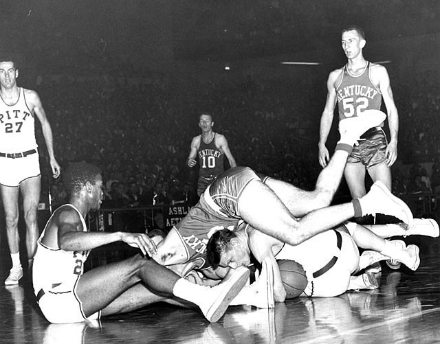 Vernon Hatton (#52) and Gerry Calvert (#10) look on from afar and Pitt's Julius Pegues has a front-row seat as another UK player and Pitt players scrum for the ball