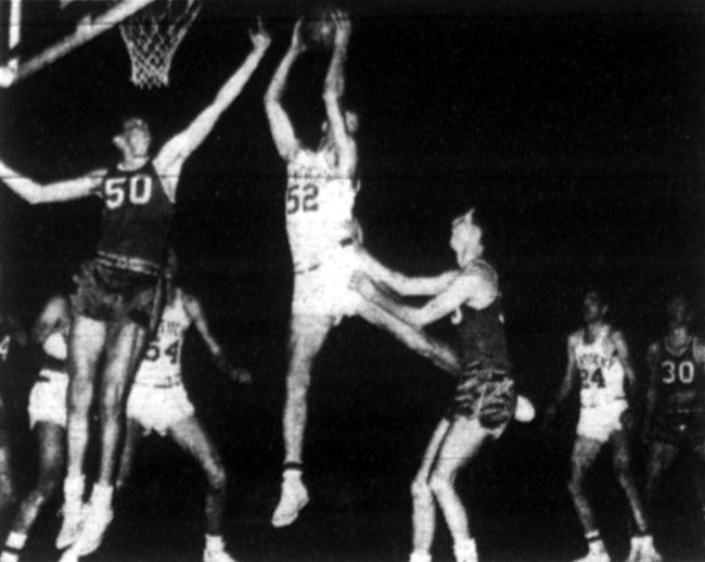 Vernon Hatton (#52) rises high to grab a rebound in between LSU's Joe Combs (#50) and an unidentified Tiger. Also seen are UK's Don Mills (#54), Johnny Cox (#24) and LSU's Wayne Monson