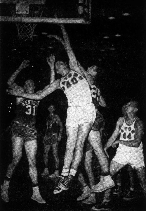 Florida's Jerry Henderson (#40) scores ahead of Johnny Cox while John Crigler (#31) and Florida's Bob Sherwood (#44) look on