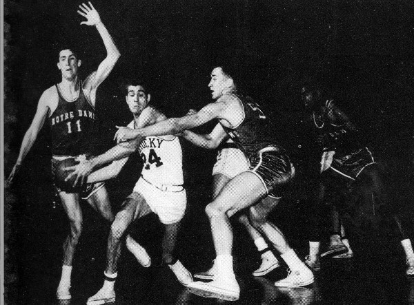 Vern Hatton hits the floor following a layup as Notre Dame players eye the bucket