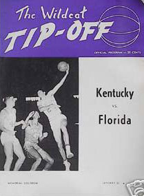 Don Mills (#52) attempts a shot but steps on Florida's Bob Sherwood's foot. Looking on are Kentucky's Bennie Coffman (#30), Dickie Parsons (#50) and Florida's Walter Rabhan (#15) and Tommy Simpson (#23)