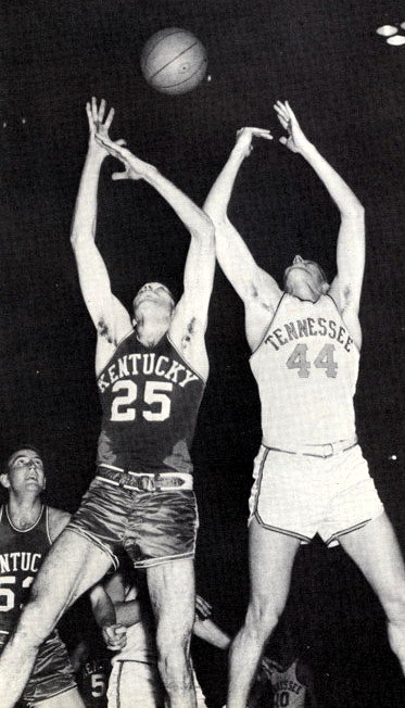 Kentucky's Johnny Cox (#25) and Tennessee's Bob Perigo (#44) reach for the ball