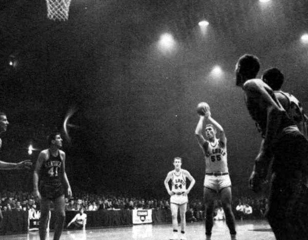 Bennie Coffman (left) and Don Mills (#53 to right) defend against St. Louis' George Burkel
