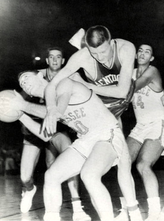 Carroll Burchett falls over a UT player while UK's Don Mills and UT's Eddie Test look on