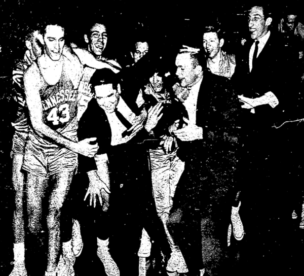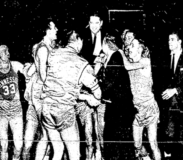 The Vol players are so excited by the victory they attempt to lift their coach, John Sines, on their shoulders....