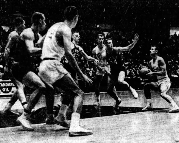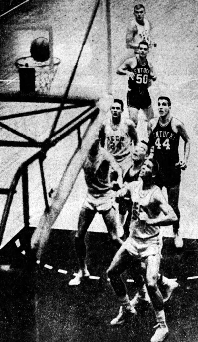 Dick Parsons (#50) watches as his shot drops through the net. Also shown are Georgia Tech's John Hoffman (#44 behind Parsons), John Gher (#24), Keith Weekly (under hoop), and Alan Nass (lower right). UK players include Bill Lickert (#44) and Roger Newman (with glasses)
