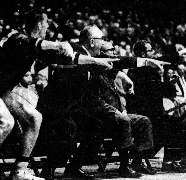 Player Vincent Del Negro and Head Coach Adolph Rupp offer assistance from the bench to the referee in making a call