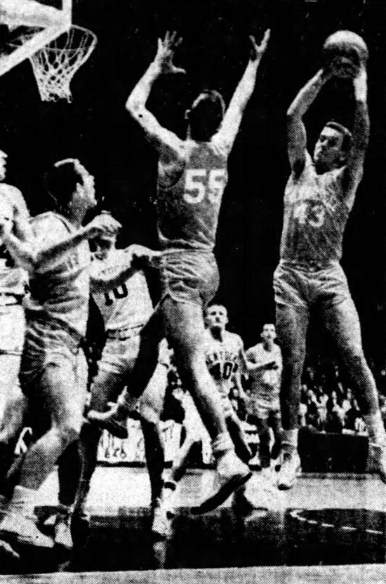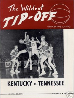 Kentucky's Carroll Burchett and Tennessee's Orb Bowling (#55) fight for a rebound while Bill Lickert (#44) and UT's Dick Fisher stand by