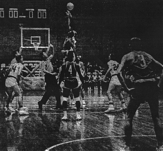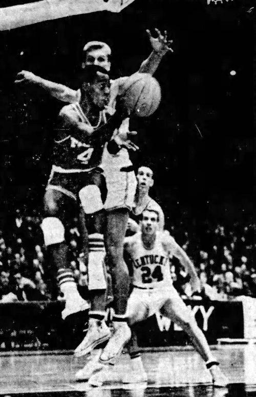 Cotton Nash jumps against Miami's Ralph Wright to open the 1961-62 season. Also in the photo are Kentucky's Scotty Baesler (#14) and Larry Pursiful (#24) along with Miami's LeVern Benson (#4) and Gerald Saunders (#3)