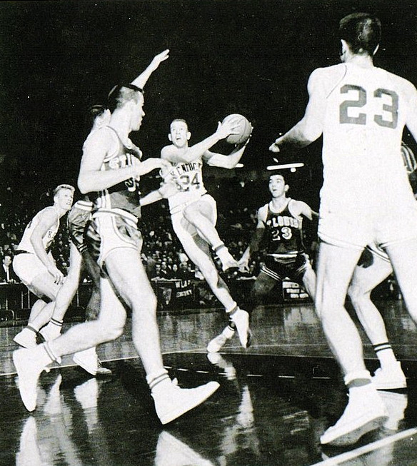Cotton Nash (#44) cuts through two defenders to the hoop
