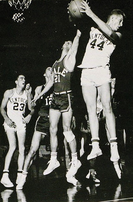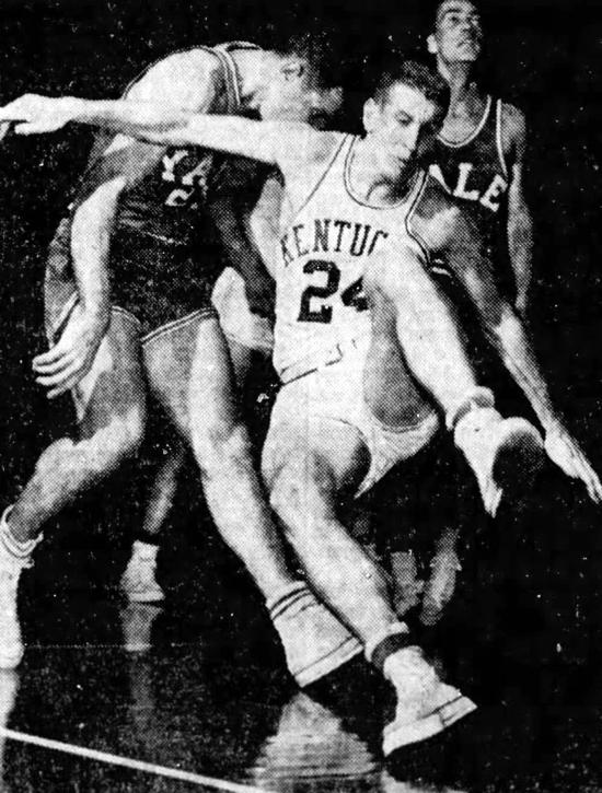 Scotty Baesler (#14) watches the ball go out of bounds while preventing two Yale players Rick Kaminsky and Richard Derby (#14) from retrieving the ball. Also shown are UK's Roy Roberts (#23), Allen Feldhaus (#12) and Cotton Nash.
