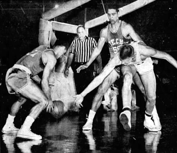 Carroll Burchett reaches for a loose ball while Georgia Tech's Frank Landrey tries to regain possession. Tech's Alan Nass and referee Harold Johnson look on.