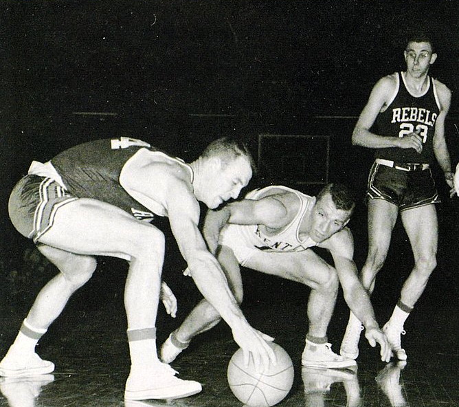 Cotton Nash grabs a rebound in front of Bill Bolton (#22)