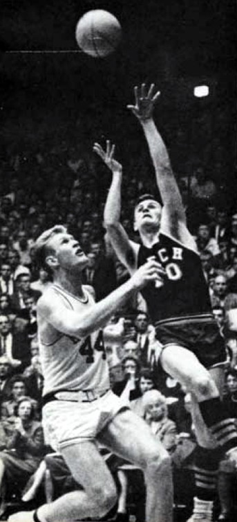 Leland Melear (#10) drives against Cotton Nash (#44)