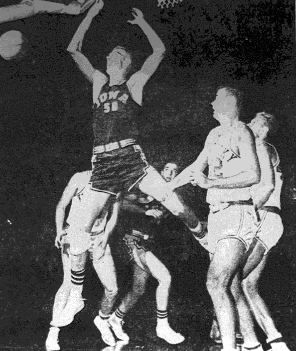 Iowa's Bill Skea (#50) skies for the ball while Charles Ishmael (#22) and Cotton Nash look on