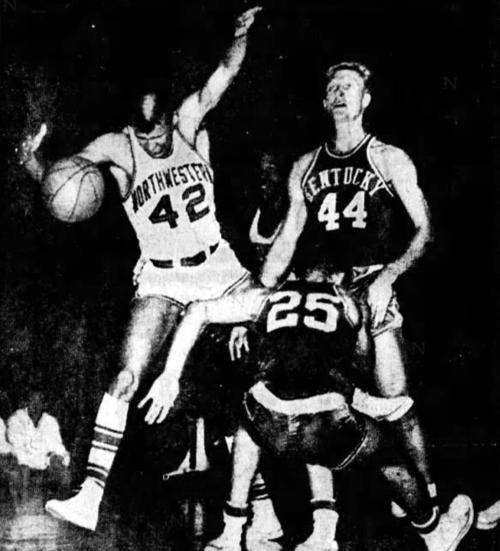 Northwestern's Phil Keeley shoots while defended by Ted Deeken (#12). Cotton Nash (#44) and Larry Conley (#40) look on