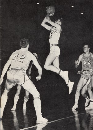 Cotton Nash (#44) turns to shoot in front of Larry Conley (#40)