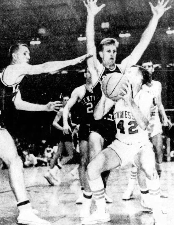 Tennessee's Larry McIntosh (#42) is trapped between Kentucky's Cotton Nash and Larry Conley (left)