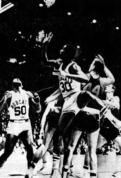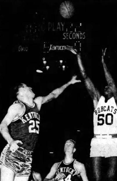Ohio's Don Hilt (#50) shoots over Terry Mobley (#25) as Cotton Nash (#44) looks on