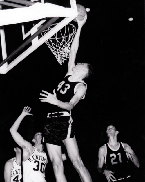 Vanderbilt's Clyde Lee (#43) scores inside as Wayne Taylor (#21) and Kentucky's Tommy Kron (#30) and Brad Bounds look on
