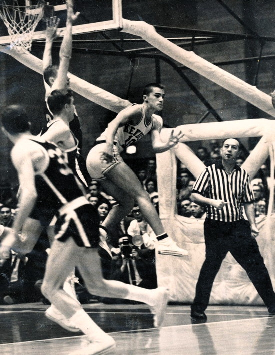 Louie Dampier passes the ball out while referee Lou Bello looks on