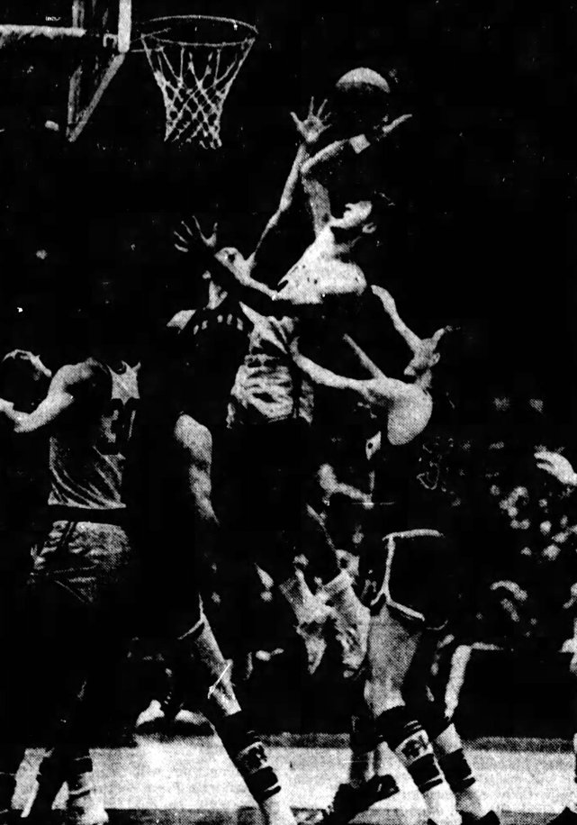 Notre Dame's Jim Monahan (#42) shoots over Pat Riley (also #42) while Tommy Kron (#30) tries to get a hand in. Larry Conley blocks out Brian Keller in the background.