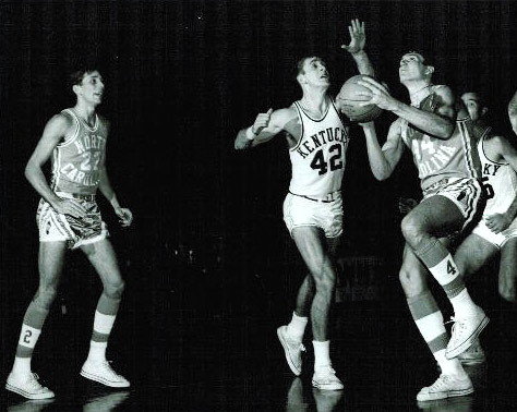 Pat Riley (#42) defends against UNC's Larry Miller (#44) as Bob Lewis (#22) looks on