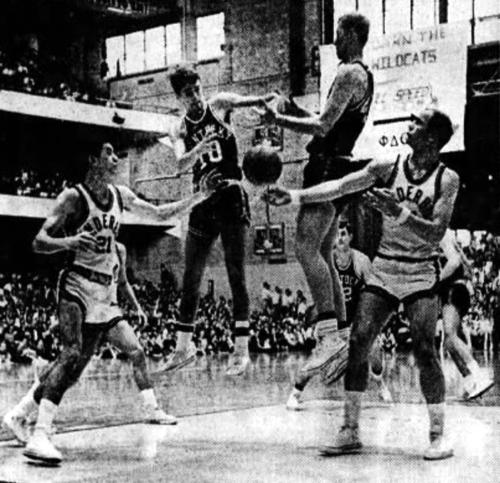 The ball drops between Kentucky's Louie Dampier (#10) and Cliff Berger...