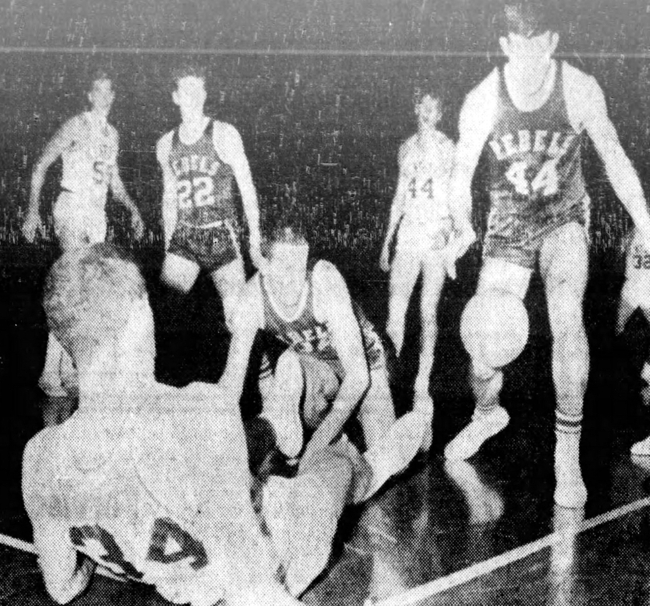 Mike Casey (#34) and Mississippi State's Ken Turner fall to the floor going after a loose ball which MSU's Jerry Brawner (#44) is able to scoop up. Thad Jaracz (#55) and Dan Issel (#44) are seen in the background
