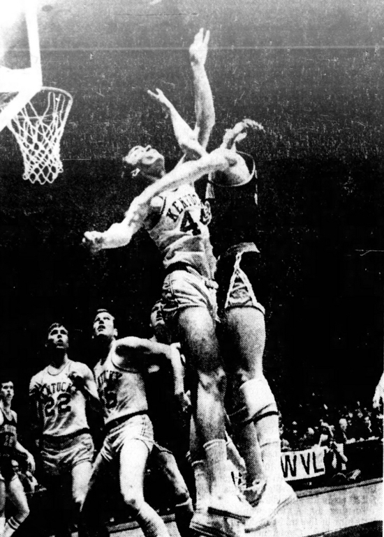 Auburn's Walter Tinker squares off against Dan Issel inside while Mike Pratt (#22) and Thad Jaracz prepare to rebound