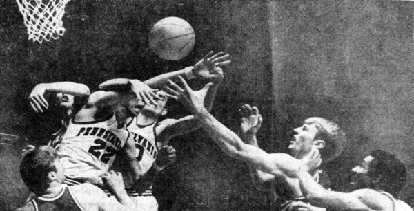 Penn's Carl Robbins (#22) and Steve Bilsky reach for the rebound while Mike Pratt, Larry Steele, Dan Issel and Penn's Pete Andrews watch