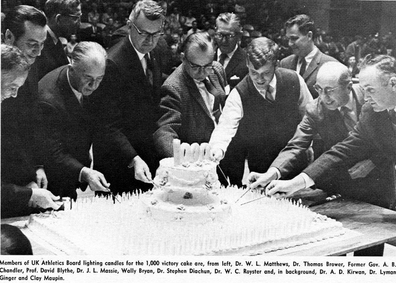 Phil Argento watches as coach Rupp prepares to cut the 1000th victory cake with Tommie Bryant and Wylie B. Wendt (team manager 1906)