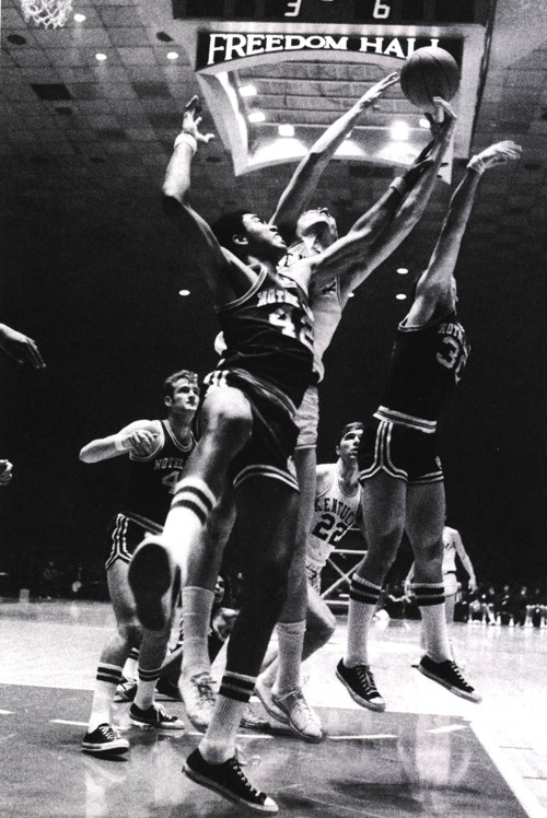 Notre Dame's Austin Carr passes the ball as he's defended by Bob McCowan (#11) and Mike Pratt (#22)