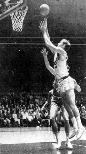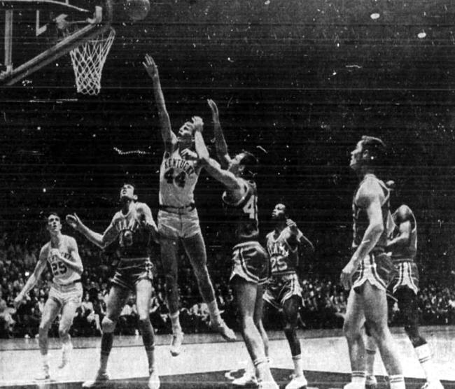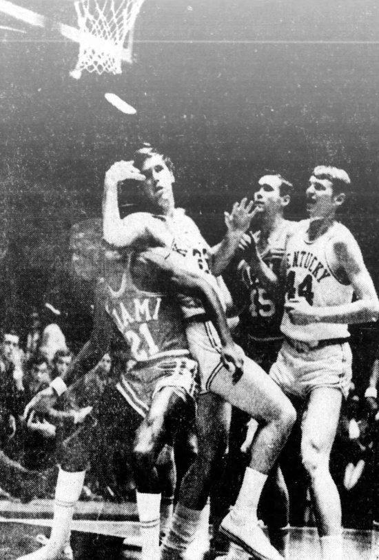 Dan Issel (#44) rises to score while the entire Miami team can only watch. Shown are left to right UK's Larry Steele (#25), Miami's Glen Pryor (#43), Issel, Miami's Terry Martin (#45), Gerald Sears (#25), Tim Meyer and Darrel Dunlap