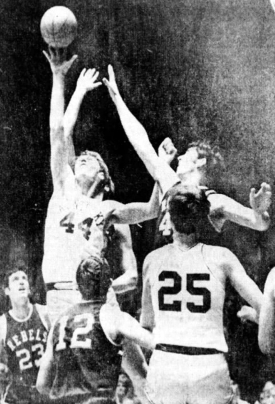 Dan Issel (#44) reaches for the ball with Ole Miss player Lock Ross (#44) while Larry Steele (#25) and Ole Miss player Cecil Jones (#12) and (#23) look on