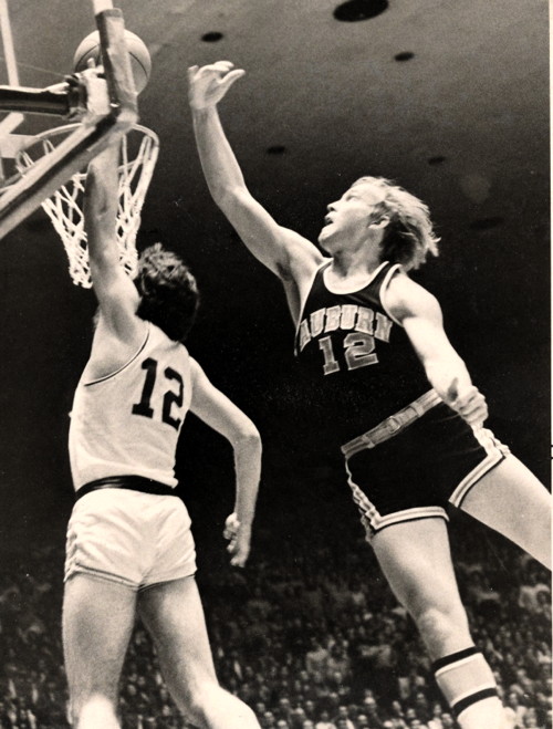 Larry Steele (left) and Kent Hollenbeck try to put the clamps on Auburn star John Mengelt