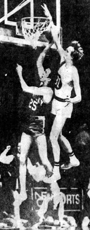 Larry Steele (#25) has his layup attempt blocked by Marquette's Gary Brell (#31)