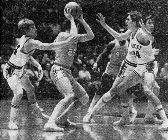 Tennessee's Mike Edwards (#25) looks to pass while guarded by Kentucky's Ronnie Lyons (#14) and Mike Flynn (#24)