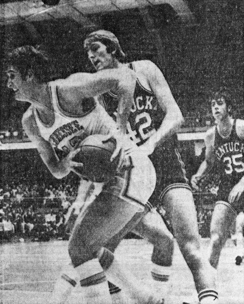Tennessee's Doug Ashworth secures the ball in front of Bob Guyette (#42) while Kevin Grevey (#35) looks on